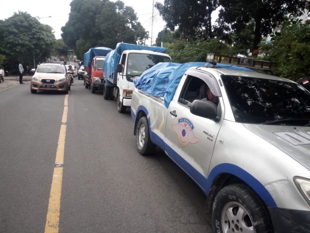 Empat truk yang mengangkut bantuan masing-masing milik Dinas PUPR, DLH, Dishub, Satpol PP.