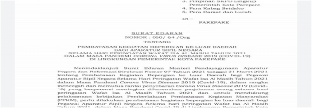 Larangan tersebut tertuang dalam Surat Edaran nomor 060/64/Org tentang Pembatasan Kegiatan Bepergian ke Luar Daerah Bagi Aparatur Sipil Negara Selama Hari Peringatan Wafat Isa Al Masih Tahun 2021, yang dikeluarkan Pemkot Parepare, 31 Maret 2021.