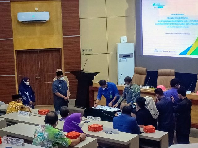 PAREPARE, SUSARAJATAPPARENG.COM — Wakil Wali Kota Parepare, Pangerang Rahim menyaksikan penyerahan kartu jaminan sosial yang diserahkan oleh BPJS Ketenagakerjaan kepada Kolektor PBB se-Kota Parepare, di Ruang Pola Setdako, Jumat (3/9/2021).
