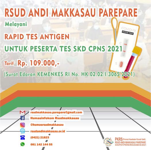 Teruntuk ibu/bapak yang akan bepergian ke luar daerah serta adik-adik sekalian peserta ujian seleksi CPNS tahun 2021. Bahwa berdasarkan Surat Edaran Kementerian Kesehatan Republik Indonesia maka tarif pemeriksaan Rapid tes Antigen di RSUD Andi Makkasau turun menjadi Rp. 109.000,-.
