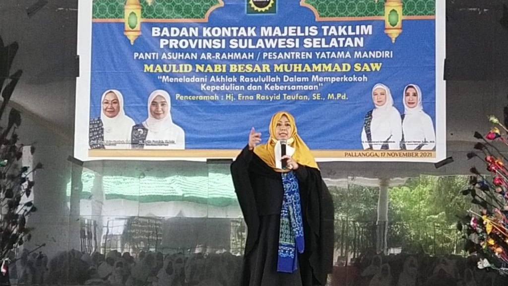Pada kesempatan itu, Erna juga mengucapkan terima kasih kepada Ketua Yayasan R Rahmah, Ketua Ponpes Yatama Mandiri, dan terkhusus Ketua BKMT Sulsel yang telah mengundang untuk memberikan ceramah pada kegiatan Maulid ini.