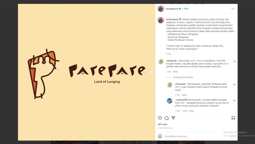 “Para pemuda tersebut ialah Muhammad Ikhsan dan Ronal Edy asal Parepare, serta Handi Nurdiawan asal Gowa. Tiga desain logo ini selanjutnya akan memasuki tahap final. Menurut ta’ mana yang bagus?,” Ungkap Taufan Pawe.