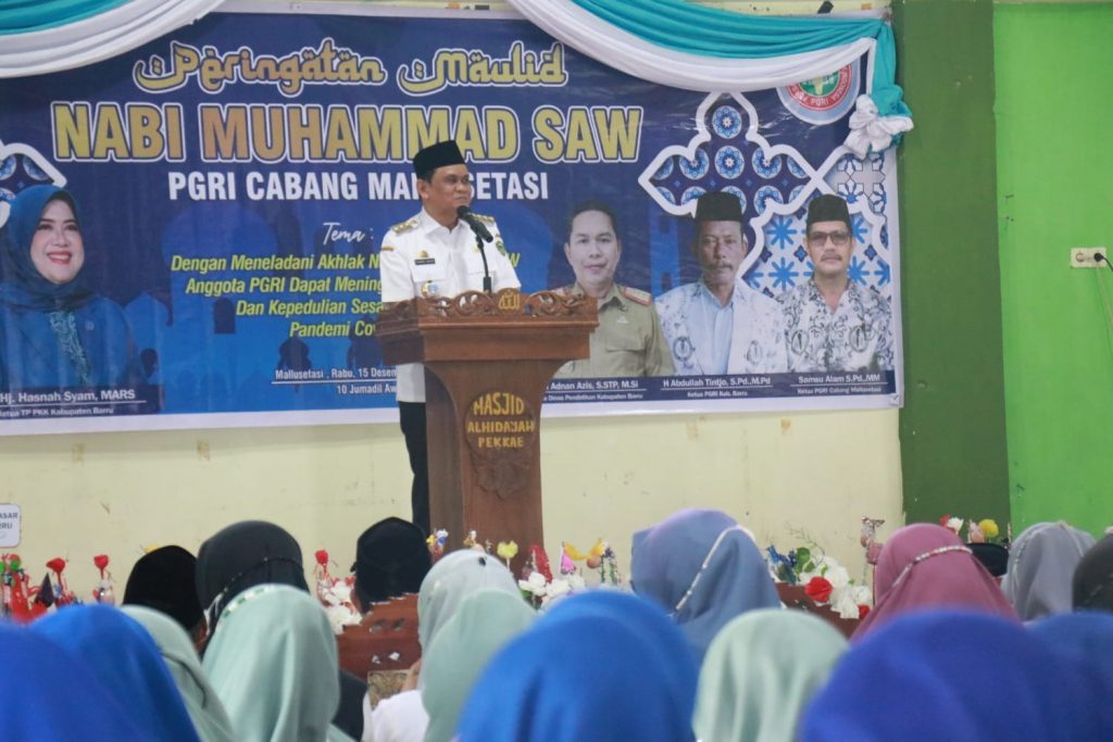BARRU, SUARAJATAPPARENG. COM – Persatuan Guru Republik Indonesia (PGRI) Cabang Mallusetasi, Kabupaten Barru, Sulsel, menggelar peringatan Maulid Nabi Muhammad SAW Tahun 1442 H di Gedung PKG Mallusetasi, Rabu, (15/12/2021).