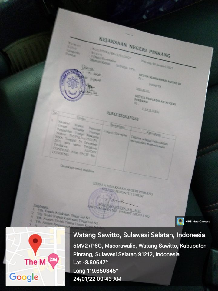 PINRANG, SUARAJATAPPARENG.COM – Kuasa Hukum, Abidin Bin Condeng, Advokat Sufyan Lahabi, SH., MH. dan Patner, menilai Pengadilan Negeri Pinrang melakukan kekeliruan dalam proses penyampaian Kasasi Pidana. Sebagaimana hasil konfirmasi tim kuasa hukum di Pengadilan Negeri Pinrang, (24/01/2022).