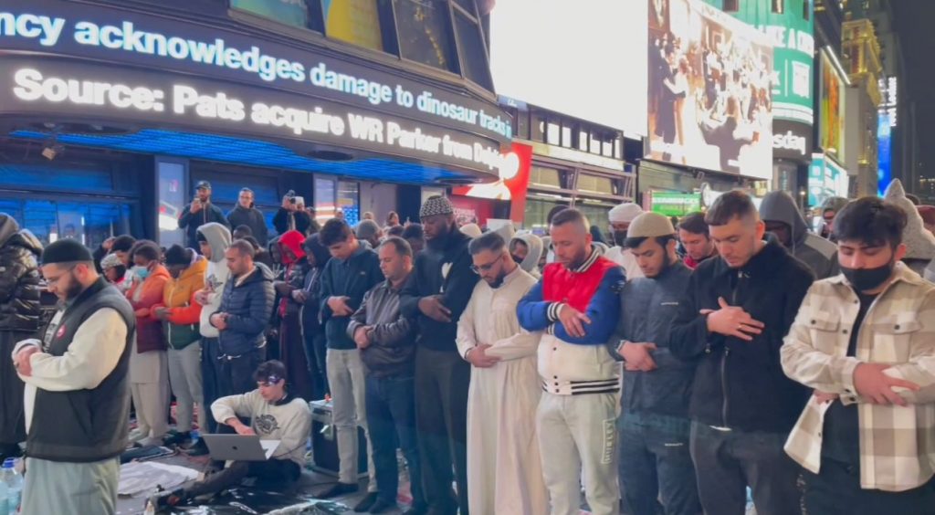 6 April 2022. Salah satu fenomena menarik terjadi di awal Ramadhan tahun ini adalah ketika ratusan Muslim di Amerika kembali bangkit, bersatu, dan berkumpul untuk menyelenggarakan shalat “Tarwih” berjamaah di malam kedua Ramadhan tahun ini di Times Square, Manhattan, New York City. Mereka menunjukkan kepada dunia bahwa kami, Muslim Amerika adalah pecinta perdamaian.