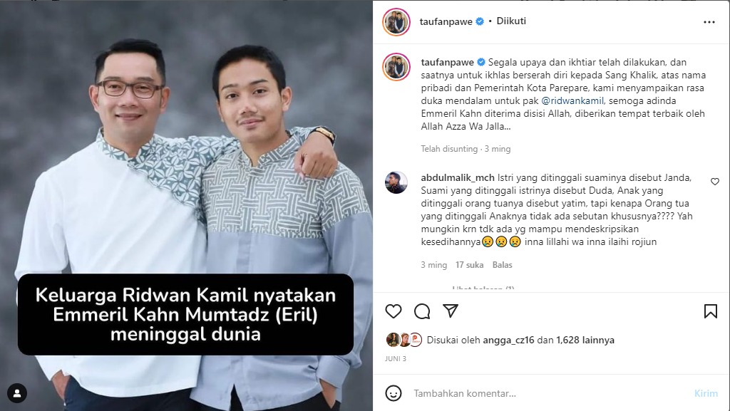 “Segala upaya dan ikhtiar telah dilakukan, dan saatnya untuk ikhlas berserah diri kepada Sang Khalik, atas nama pribadi dan Pemerintah Kota Parepare, kami menyampaikan rasa duka mendalam untuk Pak Ridwan Kamil, semoga adinda Emmeril Kahn diterima disisi Allah, diberikan tempat terbaik oleh Allah Azza Wa Jalla,” ungkap Taufan, Jumat (3/6/2022).