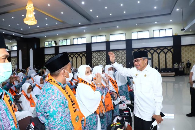 MAKASSAR, SUARAJATAPPARENG.COM — Wali Kota Parepare, Taufan Pawe (TP) memimpin penyerahan 61 Calon Jemaah Haji (CJH) asal Kota Parepare untuk bergabung ke CJH Kloter Pertama Embarkasi Makassar, di Asrama Haji, Kota Makassar, Kamis, 16 Juni 2022.