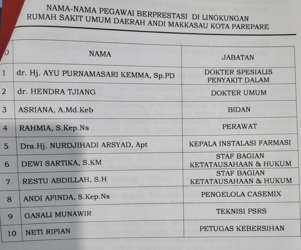 Pemberian penghargaan ini dituangkan dalam SK Direktur RSUD Andi Makkasau Nomor 51. Tahun 2022.