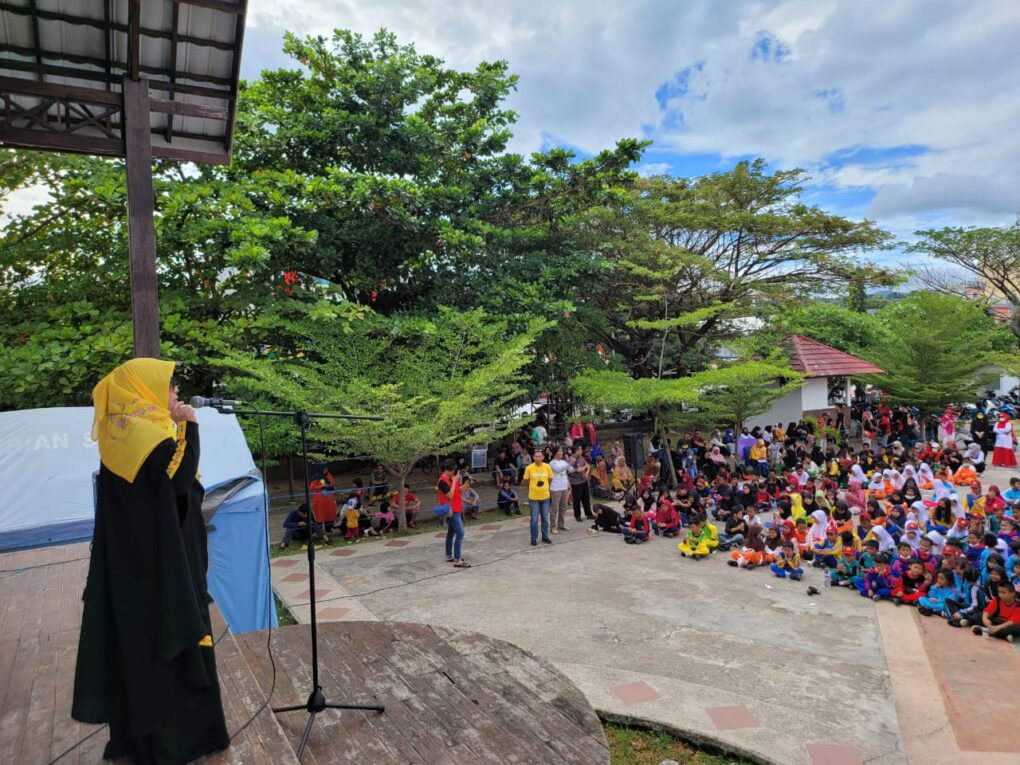 Usai bernyanyi, Erna pun berinteraksi tanya jawab dengan mereka sesuai isi lagu. “Bangun tidurku terus mandi tidak lupa menggosok gigi. Betul? Sorakan mengiyakan dari anak-anak lantang bersahutan. Erna lalu melanjutkan nyanyian yang diikuti ratusan anak-anak SD itu. “Habis mandi kutolong ibu membersihkan tempat tidurku. Apakah kita jalankan semuanya? Kalau kita jalankan berarti kita adalah anak yang baik, mau jadi anak yang baik?” lagi-lagi diiyakan oleh anak-anak yang hadir.