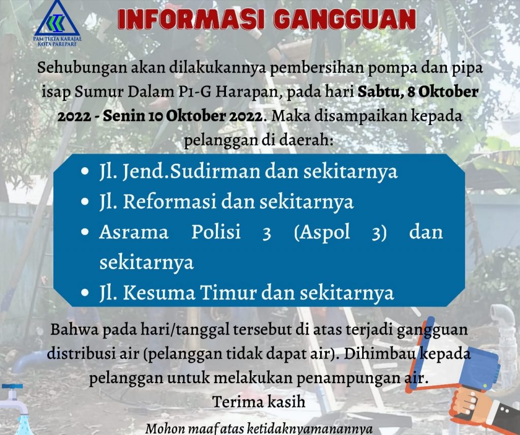 Sehubungan dengan akan dilakukannya pembersihan pompa dan pipa isap Sumur Dalam P1-G Harapan, pada hari Sabtu 8 Oktober 2022 – Senin 10 Oktober 2022, PAM Tirta Karajae berharap kepada pelanggan di daerah: