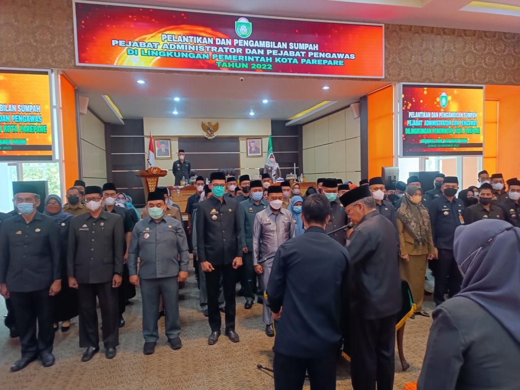 PAREPARE, SUARAJATAPPARENG.COM — Wali Kota Parepare melantik sebanyak 90 pejabat Administrator dan Pejabat Pengawas lingkup Pemkot Parepare di Auditorium BJ. Habibie Rujab Wali Kota Parepare, Jumat (14/10/2022).