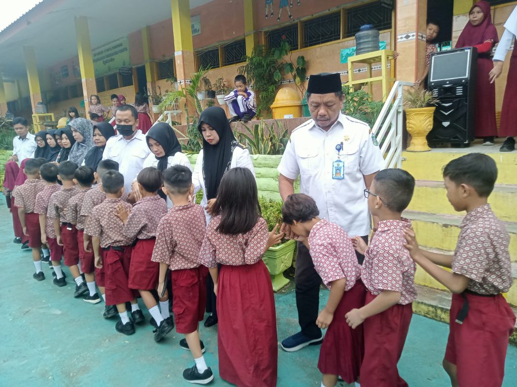 Kasek UPTD SDN 25 Parepare H Faisal Hasyim bersalaman dengan siswanya