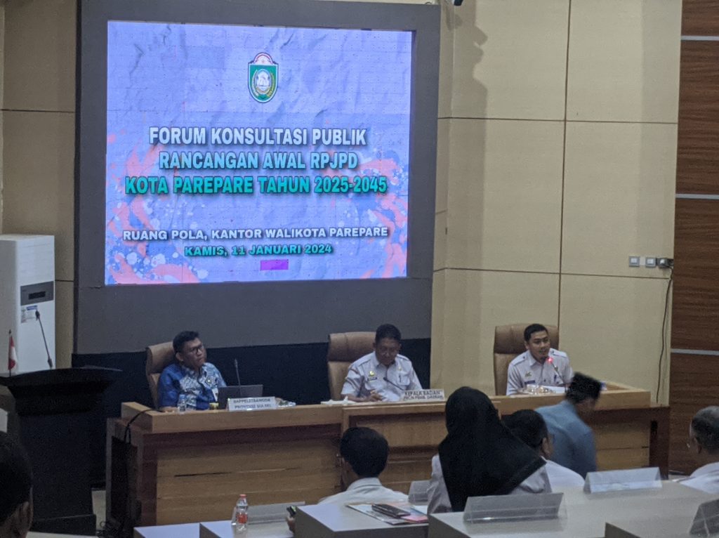 PAREPARE, SUARA AJATAPPARENG — Rumusan awal Rancangan RPJPD Kota Parepare menjabarkan visi Pembangunan daerah 2025-2045 yaitu Kota Parepare maju, berdaya saing, tangguh dan berkelanjutan.Hal itu diungkap Sekda Parepare, Muhammad Husni Syam, saat membuka konsultasi publik rancangan awal Rencana Pembangunan Jangka Panjang Daerah (RPJPD) tahun 2025-2045 yang digelar di Ruang Pola Kantor Walikota, Kamis (11/1/2024).