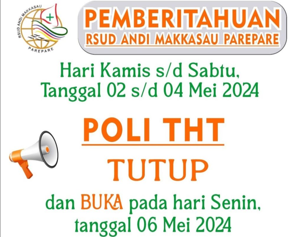 Berdasarkan pemberitahuan melalui Akun Resmi Humas RSUD Andi Makkasau Kota Parepare, yang terpantau media pada Rabu, 1 Mei 2024, bahwa pertanggal 2 hingga 4 Mei 2024, adanya penutupan Layanan Poli THT dan Buka kembali pada hari Senin, 6 Mei 2024.