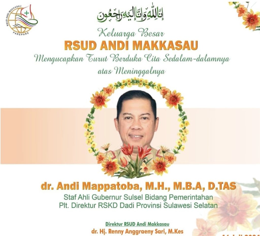 PAREPARE, SUARA AJATAPPARENG – Innalillahi Wainnailahi Rojiun, Keluarga Besar Rumsh Sakit Umum Daerah (RSUD) Andi Makkasau, Mengucapkan Turut Berduka Cita Sedalam-dalamnya atas Meninggalnya “dr. Andi Mappatoba, M.H., M.B.A, D.TAS” Plt. Direktur RSKD Dadi Provinsi Sulawesi Selatan. Selasa, 16 Juli 2024.