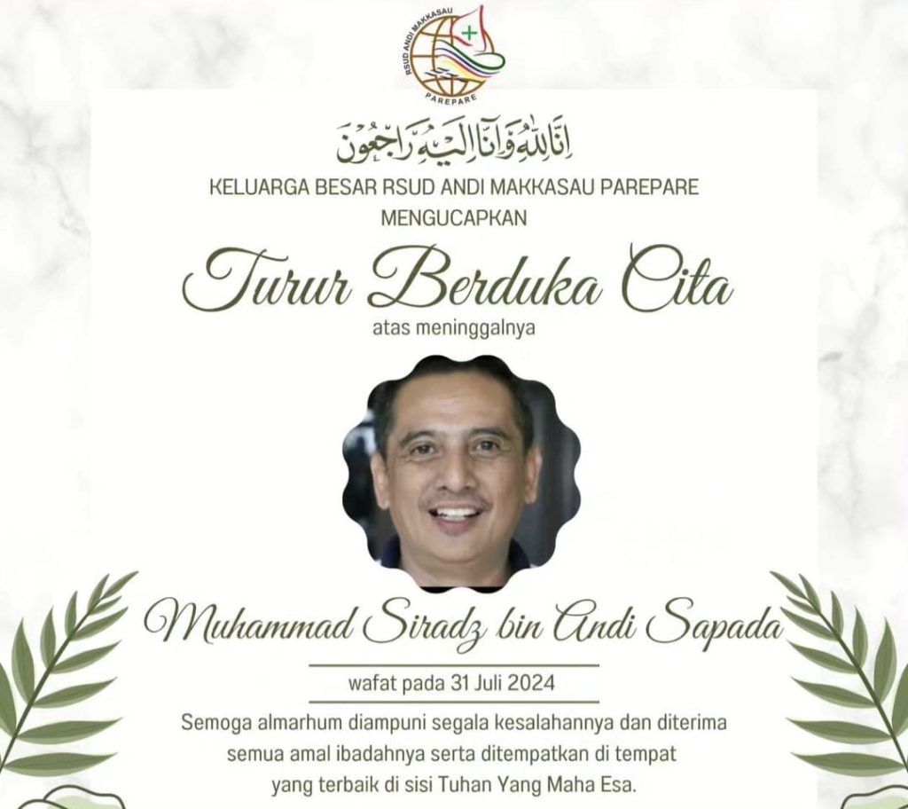PAREPARE, SUARA AJATAPPARENG – Kota Parepare kembali berduka atas meninggalnya HM Siradz Andi Sapada, suami dari Direktur RSUD Andi Makkasau, Dr. Renny Anggraeny Sari. Kabar duka ini diumumkan melalui akun resmi RSUD Andi Makkasau pada hari Rabu, 31 Juli 2024.