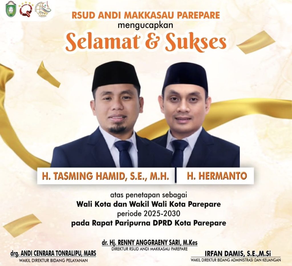 PAREPARE, SUARA AJATAPPARENG – RSUD Andi Makkasau Parepare mengucapkan selamat dan sukses kepada H. Tasming Hamid, S.E., M.H. dan H. Hermanto atas penetapan sebagai Wali Kota dan Wakil Wali Kota Parepare periode 2025-2030 dalam Rapat Paripurna DPRD Kota Parepare.