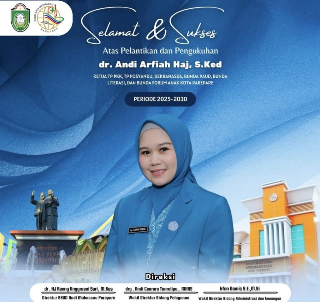 PAREPARE, SUARA AJATAPPARENG – Rumah Sakit Umum Daerah (RSUD) Andi Makkasau Parepare dengan penuh kebanggaan menyampaikan selamat dan sukses kepada Ibu Walikota Parepare, dr. Andi Arfiah Haj, S.Ked, atas pelantikan dan pengukuhannya sebagai Ketua Tim Penggerak PKK, Ketua Dekranasda, Bunda PAUD, Bunda Literasi, dan Bunda Forum Anak Kota Parepare. Selasa, 11 Maret 2025.