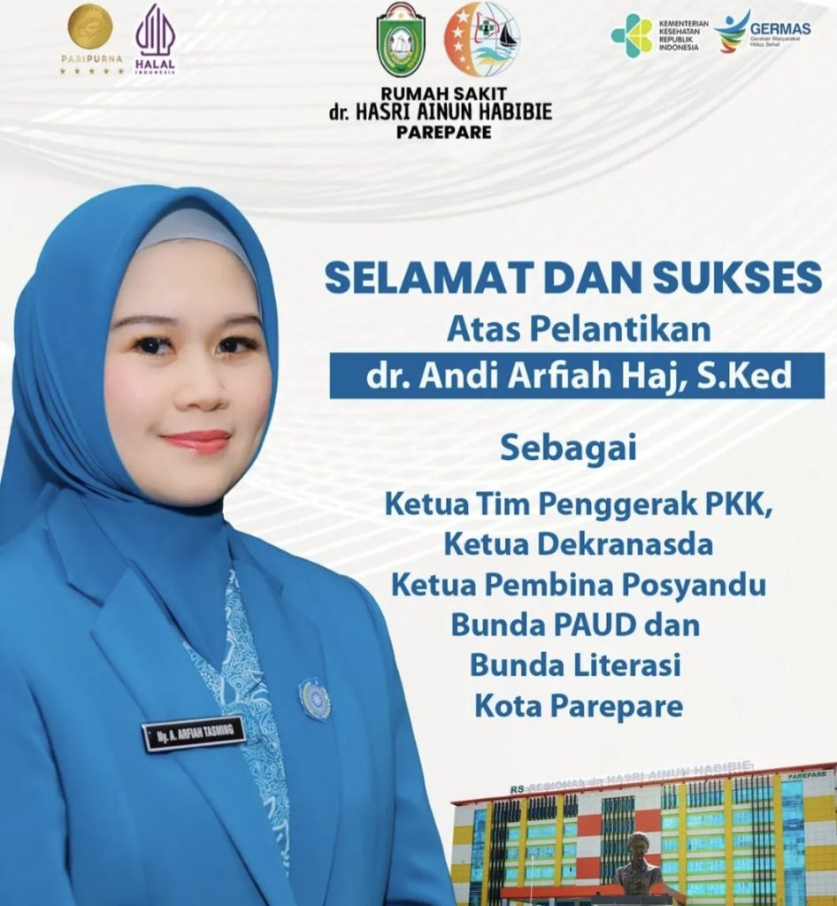 PAREPARE, SUARA AJATAPPARENG — Rumah Sakit dr. Hasri Ainun Habibie (RSHAH) Parepare menyampaikan ucapan selamat dan sukses atas pelantikan dr. Andi Arfiah Haj, S.Ked sebagai Ketua Tim Penggerak PKK, Ketua Dekranasda, Ketua Pembina Posyandu, Bunda PAUD, dan Bunda Literasi Kota Parepare. Rabu, 12 Maret 2025.